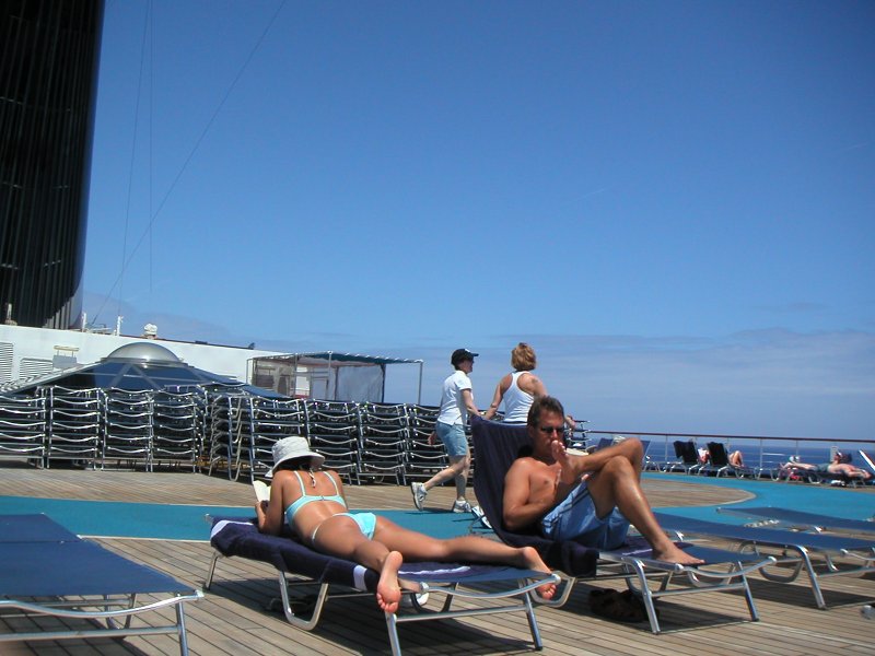 Mary Lou and Deb walking on the track on board.
